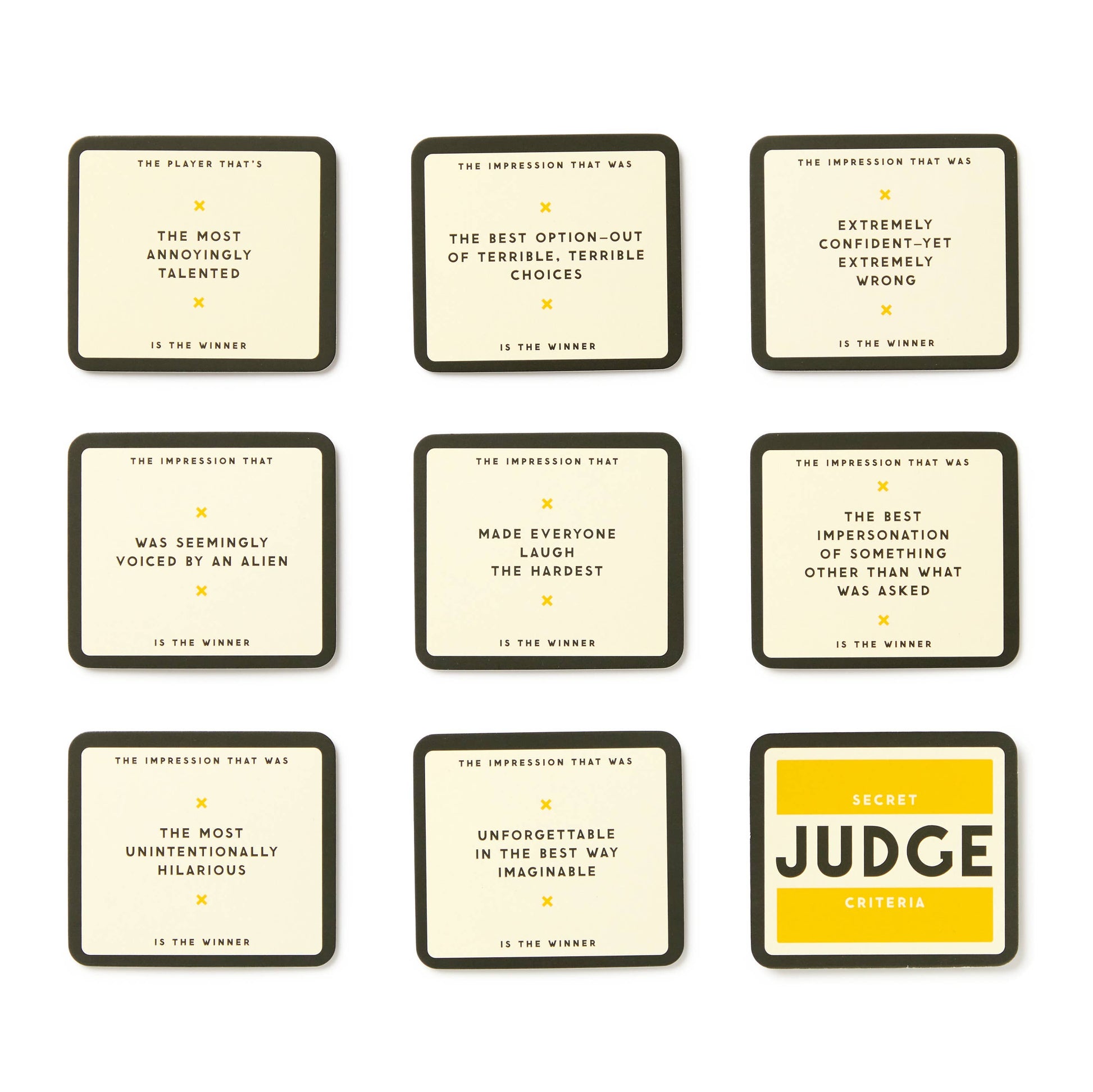 HOW TO PLAY - Each round is judged on a randomly selected (and secret) criteria. Everything from ‘most accurate’ to ‘unintentionally hilarious.’ It doesn’t matter if you’re talented or not, anyone can win when it comes to imitating a dog that’s about to throw up.