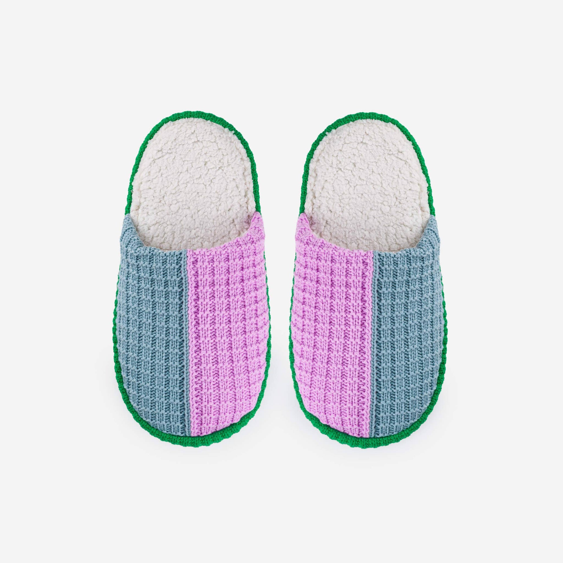 A plush, colorful take on your favorite spa-style house slippers. Backless slide slippers knit with a two-tone waffle pattern. Fully fleece-lined with slip-resistant padded soles.