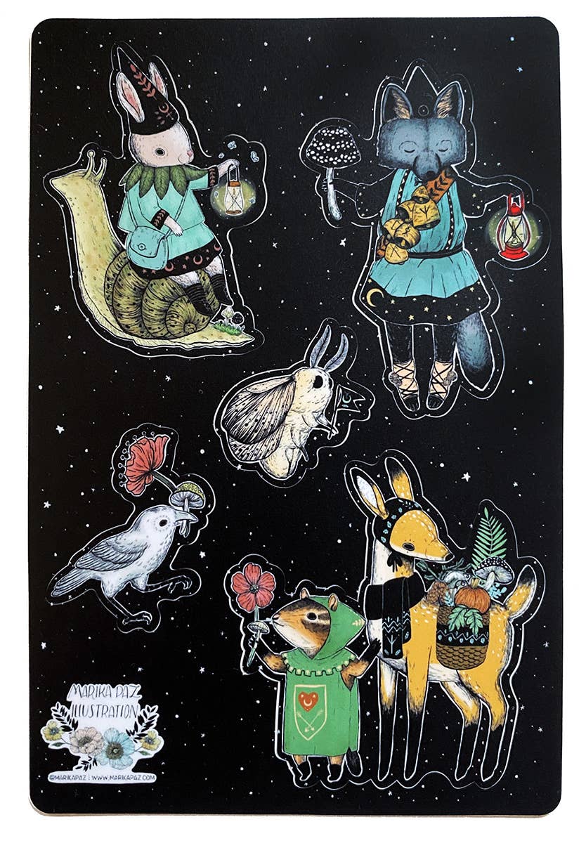Share a little magic with these little dark mage stickers! These sticker sheets have 5 kiss cut stickers of little forest mages out foraging for spell ingredients under the stars.