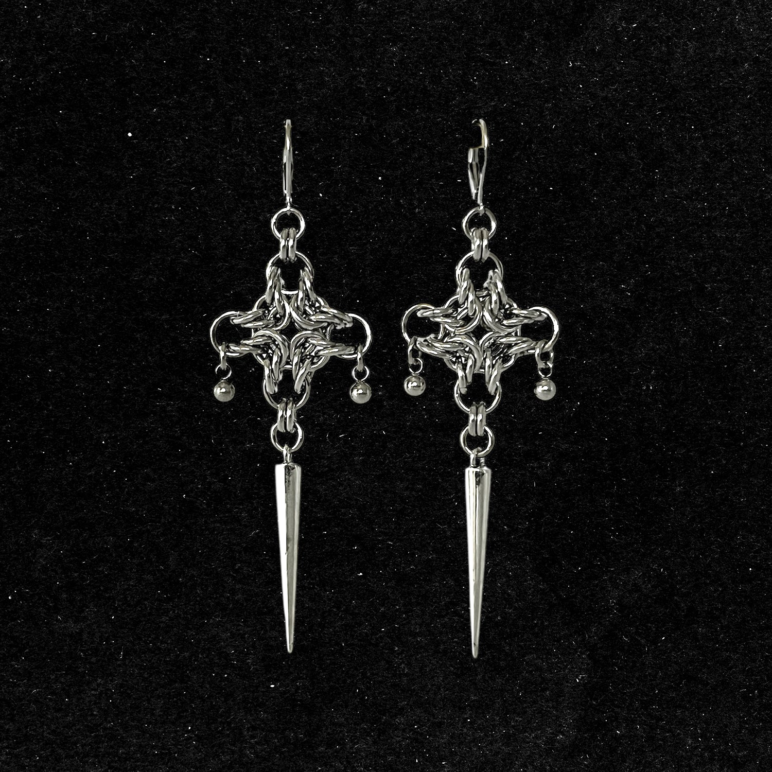 Handmade, stainless steel, chainmaille earrings in a diamond weave with a long spike. These have a stainless steel lever back earring hook so they are suitable for pierced and stretched ears. Please message me for any questions, alterations, customs, repairs, etc.