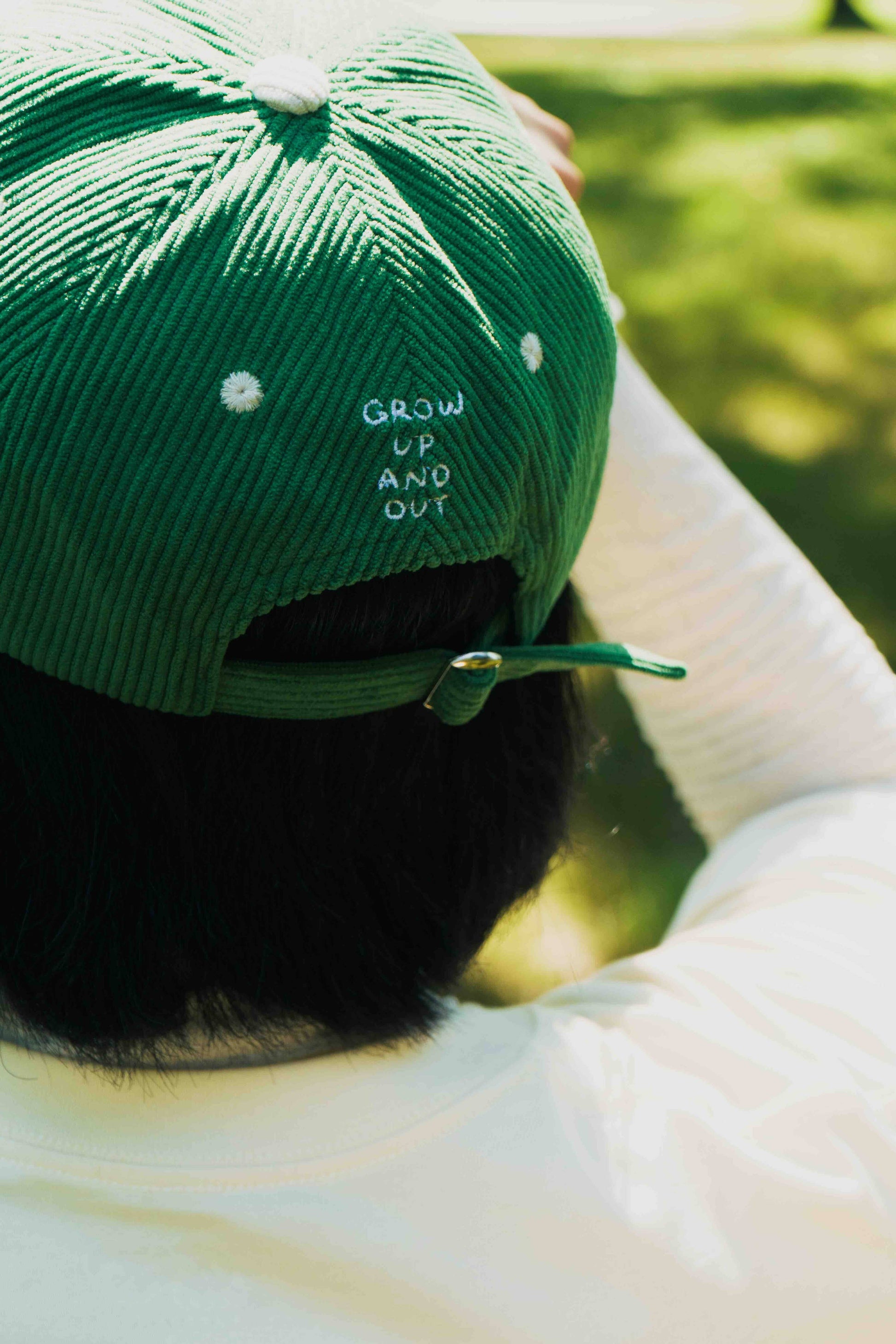 Karepango's classic corduroy baseball cap, fit with some extra personality. Make heads turn with your headgear. Styled from your head to your toes. Back embroidery: “Grow up and out”