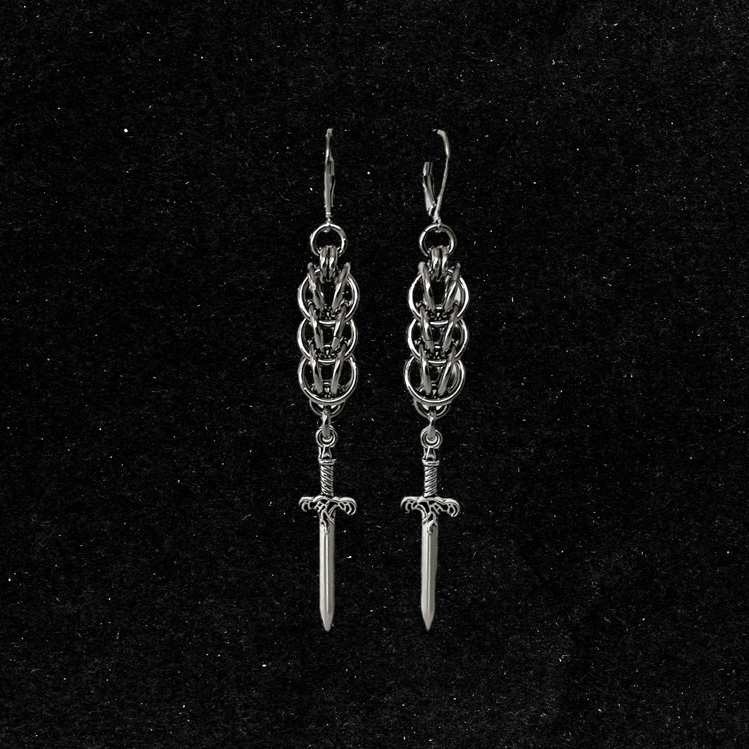 Handmade, stainless steel, chainmaille earrings with an dagger charm. These have a stainless steel lever back earring hook so they are suitable for pierced and stretched ears. Please message me for any questions, alterations, customs, repairs, etc.