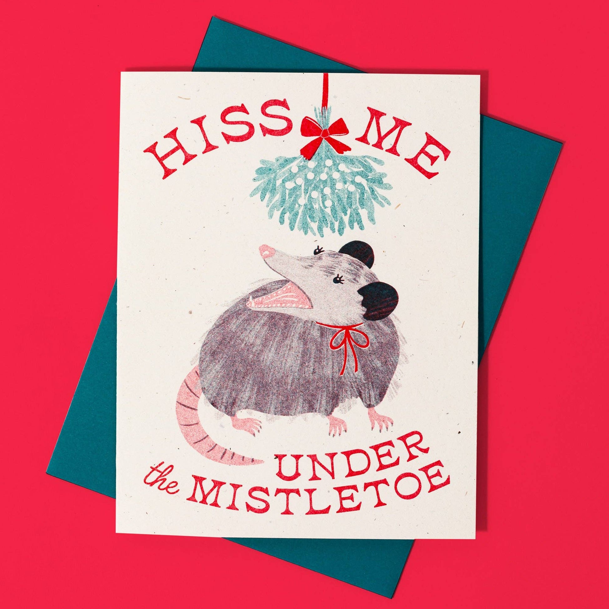 Catch this possum under the mistletoe for a little holiday hiss. For when you are feeling a little "Bah, humbug!" about Christmas but still want to be festive. A cheeky alternative to the traditional holiday card. Risograph printed in bright red and teal ink.