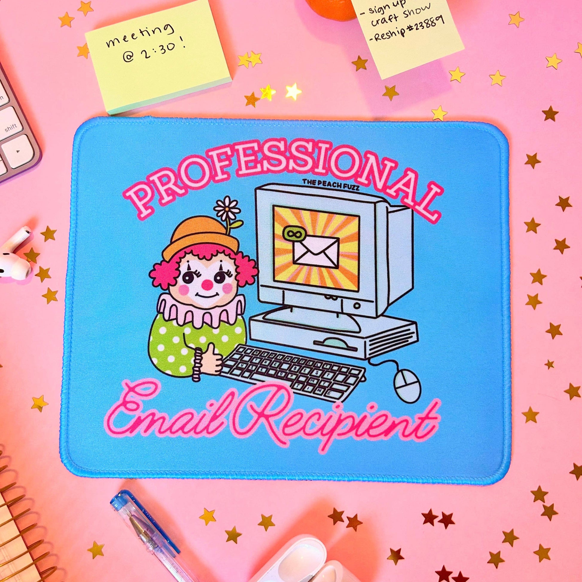 Mouse pads are a bright turquoise with an illustration of a clown at a computer and reads "professional email recipient".