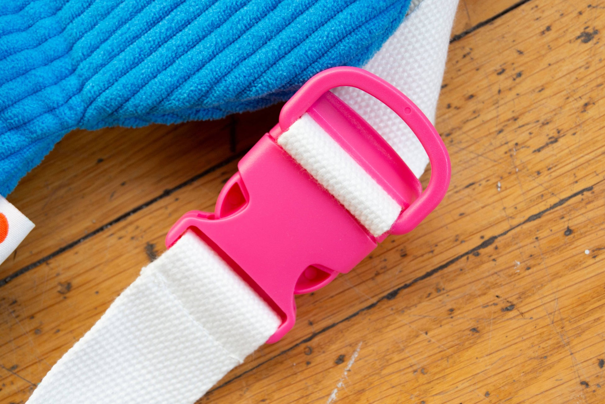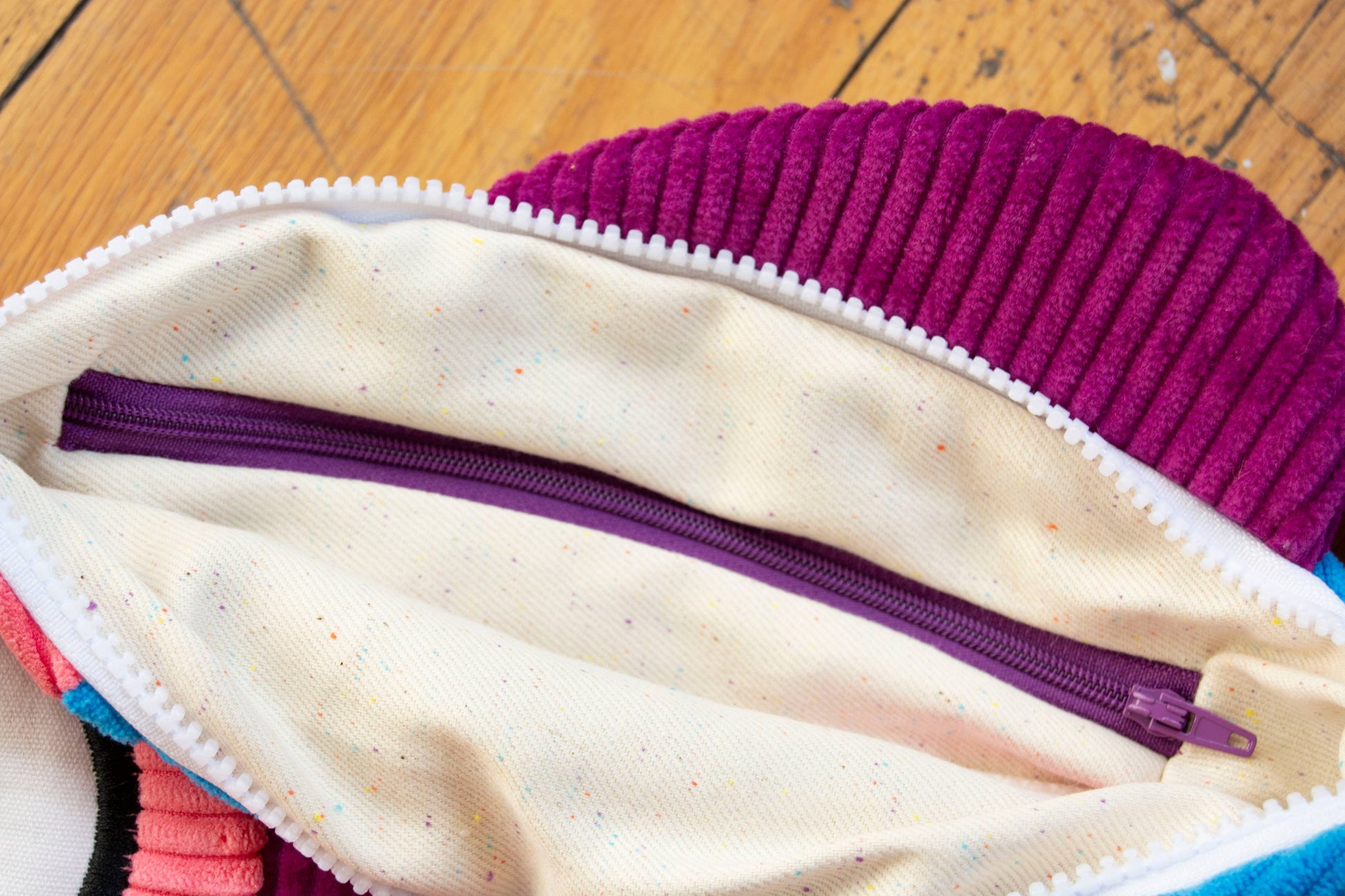 He can be worn as a crossbody or a (large) fanny pack. The interior is lined with a durable cream-colored cotton canvas tastefully flecked with multicolored 'funfetti sprinkles'.